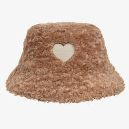 Fluffy pink borg bucket hat for girls, by Monnalisa. Lined in soft cotton for comfort, it has a faux leather logo badge on the front in the shape of a sweet heart. Paired with snuggly coats, this lovely accessory is sure to keep your little girl warm and cosy on colder days.