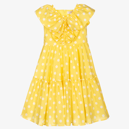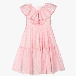 Pretty pale pink polka dot dress for girls by Italian designer Monnalisa, made in lightweight cotton. It has a large ruffle on the front and back of the bodice, with a tiered skirt lined in voile for comfort.