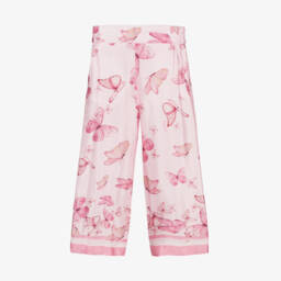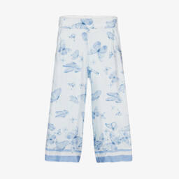 Blue butterfly silk trousers for girls by Monnalisa feature a delicate butterfly and logo design. Crafted from super soft viscose satin, these trousers promise both style and comfort with a wide-leg fit and semi-elasticated waistband. Perfect for any occasion, they offer a touch of elegance for both casual and dressy looks. Limited quantities available, so seize this opportunity to add a unique piece to any wardrobe.