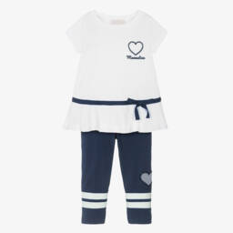 Girls white and blue fruit-themed leggings set by Monnalisa offers a delightful blend of style and comfort. The soft cotton blend fabric ensures flexibility, featuring a charming fruit print on both the top and leggings. The top is adorned with a playful ruffle hem and short sleeves, perfect for a fresh spring look. Ideal for casual outings, this set provides both fashion and ease of movement. Limited quantities available, making it a must-have for the season.