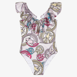 Girls white cherry and teddy swimsuit by Monnalisa, made and lined in silky, stretchy fabric. Patterned with bows, cherries, and a beige teddy bear motif, it features layers of frills for extra flounce. Perfect for young girls, this lovely one-piece ensures comfort and style. Limited quantities available—last chance to buy.