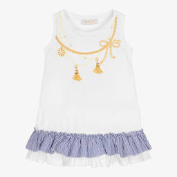 Girls white sea shell T-shirt by Monnalisa, crafted in soft cotton jersey for ultimate comfort. Featuring delicate ruffle sleeves and a charming blue sea shell appliqué adorned with starfish, diamantés, and bows. The gold Monnalisa logo above the motif adds a sparkling touch. Limited quantities available, a perfect addition to any spring or summer wardrobe.