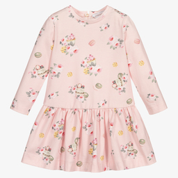 Ivory dress for little girls, by Monnalisa. Made from soft cotton jersey, it has a cute pink, green and yellow cake print and a pleated ruffle skirt.