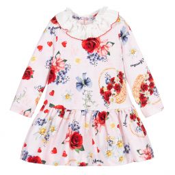 Pretty ivory dress for little girls by Monnalisa. Made in soft cotton jersey, it has a red, white and blue floral pattern. The white ruffle collar is trimmed in red scalloped embroidery.