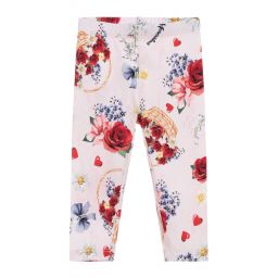 Pretty cotton jersey leggings for younger girls by Italian designer Monnalisa. They are patterned with a floral basket print and logos in red, white and blue on a navy blue background.