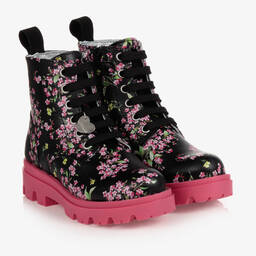 Cute pink patent leather boots for girls by Monnalisa, fastening with a side zip, laces and velcro strap across the foot. There is a sweet silver heart logo charm on the uppers, along with a sparkly rhinestone decoration on the strap. They have a silver leather insole for comfort and a pink non-slip rubber sole for added grip.