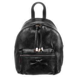 Girls metallic red leather backpack from Monnalisa, with a bow and silver logo print. It has one main compartment with an internal pouch, and a zip-up pocket on the front. The straps are adjustable and it has silver metal zip fastenings and eyelet detail.