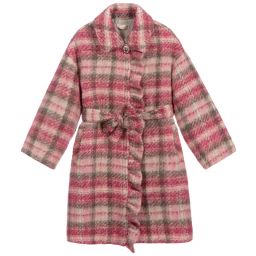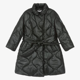 A modern long black coat for teen girls by Italian brand Monnalisa, in a silky smooth, quilted design. Both practical and stylish, this lightly padded coat has a collared neckline with a pack-away hood neatly concealed on the back of the neck and a tie belt around the waist. It has front pockets for warming hands in the cold and double-breasted popper fastenings on the front for a secure fit and feel. Rubberised branding on one arm effortlessly finishes the look.
