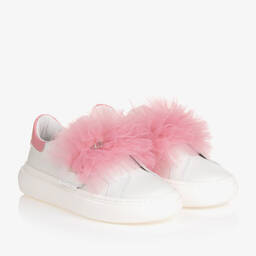 Teen girls white leather black tulle trainers by Monnalisa feature stylish black tulle ruffles on the velcro straps with white rubberised logos, adding a unique touch. The silver logo-engraved heart charm on one shoe enhances the designer appeal. Crafted from smooth leather with soft leather lining, these trainers have black heart-shaped detailing on the heels and non-slip rubber outsoles. Limited quantities available, last chance to buy.