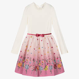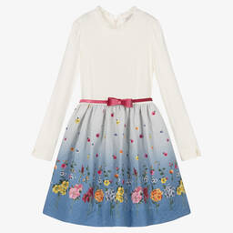 Gorgeous ivory and blue statement dress for teen girls by Italian brand Monnalisa. The ivory viscose jersey bodice is slightly fitted, with a frilled neckline and a concealed zip fastening around the back. The pink ombré jacquard skirt has a colourful floral print and comes with a detachable, adjustable, pink velvet belt. It has a soft twill lining for comfort, with a tulle frill for extra volume.