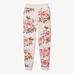 Cute and casual red joggers for teen girls by Monnalisa, made in soft and stretchy cotton jersey with a fleecy inside. In a pink and green floral artwork design, they have useful front pockets, and a comfortable elasticated waistband and cuffs.