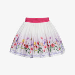 Monnalisa Chic girls stunning white lace and tulle tutu skirt. This eye-catching style features multiple layers of hankerchief point lace, spot embroidered tulle and gold edged chiffon bows to create a full and floaty design that little girls will just love to wear. The skirt has a thick elasticated waistband which makes it easy to take on and off and it is fully lined in soft cotton for comfort.