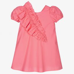 Pale yellow dress for girls by Monnalisa, made in lightweight cotton poplin. It has gorgeous puffed sleeves and a ruffle sash detail across the front and down the back. There is a diamanté logo on the front and a zip fastening on the back.
