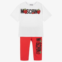 Girls black and white leggings set by Moschino Kid-Teen. The T-shirt has dropped shoulders with strawberry beaded appliqué and logo embroidery on the front. The white leggings have matching strawberry logo embroidery and an elasticated waistband.
