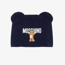 Cute bright blue bucket hat for little boys and girls, by Moschino Baby. Made in soft, lightweight cotton, it has the brand's Moschino Teddy Bear logo printed on the side wearing a cool pair of sunglasses, and a blue grosgrain ribbon trim.