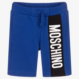 Royal blue shorts for boys by luxury designer Moschino Kid-Teen, made in soft cotton jersey. They have an elasticated drawstring waist, side pockets, and a white logo down one leg on a black panel.