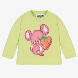 Bright blue Mini-me top for little boys by Moschino Baby, made in soft organic cotton jersey. Fastening easily with shoulder poppers, it has an adorable Baby Tiger and red logo balloon print on the front.
