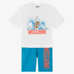 Navy surfing bear short set for boys by Moschino features a comfortable cotton jersey fabric. The navy top is adorned with a playful windsurfing bear and a bold orange logo, while the white shorts offer a matching logo and practical side pockets. An elasticated drawstring waist ensures a snug fit. Perfect for casual outings, this set is available in limited quantities—last chance to buy this stylish duo for spring and summer adventures.