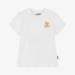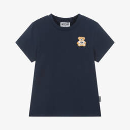 The black small bear logo t-shirt for boys by Moschino features the iconic Teddy Bear logo, adding a playful designer touch. Crafted from soft, knitted cotton jersey, this piece ensures comfort and style for everyday wear. Its classic round neckline and short sleeves make it perfect for layering or wearing solo during warmer months. With limited quantities available, this coveted item is a must-have addition to a young wardrobe.