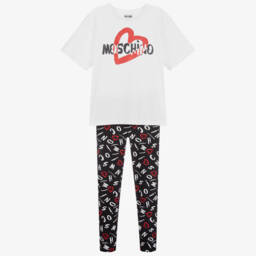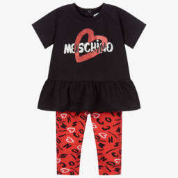 Cute black tunic and leggings set for girls by Moschino Kid-Teen, made in soft and stretchy cotton jersey. The top has a dropped waist with a ruffle hem and a ribbed crew neck. For a statement designer look, the brand's cute Moschino Teddy Bear is printed on the front with a red heart. The full length leggings have a fun red heart pattern with Moschino Teddy Bears and white logo prints.