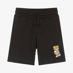 Casual black shorts for girls by Moschino Kid-Teen, made in comfortable cotton jersey. They have a stretchy drawstring waist for comfort and a Moschino Teddy Bear logo printed on one leg for a distinctive designer look.