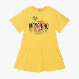 Girls white cotton dress by Moschino, crafted from soft jersey fabric. This delightful dress showcases the iconic Moschino Teddy Bear enjoying a day under a palm tree, adding a playful touch to the T-shirt style design. Featuring a ribbed neckline and dropped waist, it offers a cool and comfortable fit, perfect for warm days. With limited quantities available, this is a last chance to buy this exclusive piece.