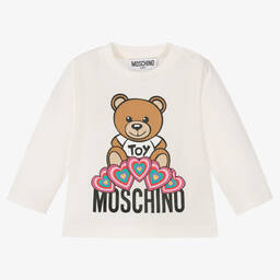 Bright pink top for little girls by Moschino Baby, made in stretchy cotton jersey. The Moschino Teddy Bear logo is printed on the front above diamanté-detailed love hearts. It has long sleeves for warmth and the popper fastenings on one shoulder make dressing easier.