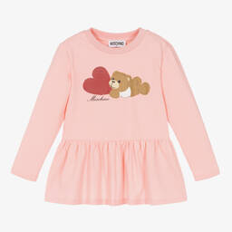 Orange-red cotton tunic top for girls by Moschino Kid-Teen, made in soft, stretchy jersey. In a longer-length silhouette, this cute top is designed with the brand's loveable Teddy Bear character, glittering pink heart, and white script logo on the front. The hem is ruffled for that sweet, girly look.