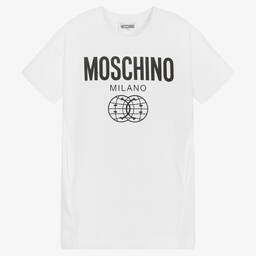The girls white cotton beach dress by Moschino Baby is patterned with a fun and colourful beach-inspired logo design. This delightful dress features a V-shaped back with gentle elastic for added comfort and fastens on one side with a concealed zip. Adorned with bows on the shoulders for a charming touch, this dress is crafted from soft poplin cotton, making it perfect for sunny days. Limited quantities available, last chance to buy.