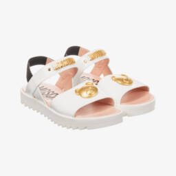 Girls white and gold sandals by Moschino Kid-Teen feature a stylish white leather design with a sparkling gold diamanté logo on the front. These sandals are crafted with metallic gold trims for a glamorous look, velcro straps for easy fastening, a lightly padded lining, and rubber grips on the outsole for better traction. Perfect for adding a touch of elegance to any outfit. Limited quantities available, last chance to buy.