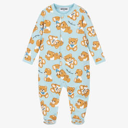 Pale pink babygrow for girls by Moschino Baby, made in soft cotton jersey. Unmistakably Moschino, it has an all-over Teddy Bear logo pattern and popper fastenings on the front for easy dressing.