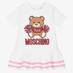 Pink dress for little girls by Moschino Baby, made in soft and mid-weight cotton jersey. It has an adorable Moschino Teddy Bear cheerleader logo on the front and a sporty white striped trim on the skirt. There are raglan sleeves and popper fastenings on the back.