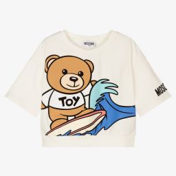 Black Mini-me T-shirt for teen girls by Moschino Kid-Teen. Styled in a boxy fit, it has a fun surfing Moschino Teddy Bear logo with blue waves and black flocked outlines. Made with soft and stretchy cotton jersey, the designer's logo is on one sleeve cuff in black flocking. The hem and neckline are gently ribbed.
