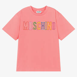 Lovely pink maxi-length cotton T-shirt for teen girls by luxury Italian designer Moschino Kid-Teen, as seen in the adult collection. On the front is a colourful embroidered logo, with a home-spun feel. It is made in stretchy cotton jersey, with a comfortable, relaxed, oversized fit and a ribbed neckline.