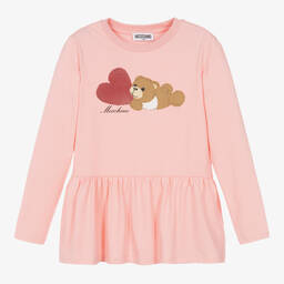 An orange-red cotton tunic top for teen girls by Moschino Kid-Teen. Stamped on the front is the label's iconic Teddy Bear logo, with a glittering pink heart and white script lettering. Great layered over leggings or casual trousers, this longline top has a ruffled peplum-style hem. It is made from super-soft and stretchy jersey for comfortable wear.