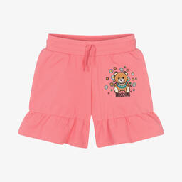 White shorts for teen girls by Moschino Kid-Teen, embellished with glamorous gold diamantés. Printed with the signature Moschino Teddy Bear, they have a feminine ruffle trim. They are made in soft cotton sweatshirt jersey, with a comfortable drawstring waist and have useful concealed side pockets.