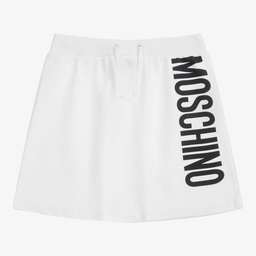 Teen girls yellow cotton jersey skirt by Moschino Kid-Teen, with a black logo print. Soft and mid-weight, it has a stretchy ribbed waistband with drawstring ties.