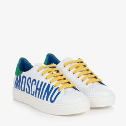 White leather trainers for teen girls by luxury Italian brand, Moschino Kid-Teen. These low-top trainers have large pink logo lettering on the sides for a bold, branded impact. They fasten with contrasting red laces with darker pink and red trims at the heels for a colourblock vibe.