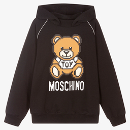 Stylish white cotton hoodie for teen boys and girls by Italian brand Moschino Kid-Teen, made in mid-weight cotton jersey with a fixed hood. It has the designer's Moschino Teddy Bear logo print on the front in a cool pixelated form, with a logo motif. There is also light reflective silver piping down the shoulder seams.