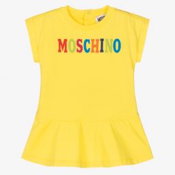 White Mini-me dress for little girls by luxury designer Moschino Baby, made in soft and stretchy cotton jersey. It has a colourful flocked logo on the front, with popper fastenings on the back. There is a ribbed neckline and a gathered skirt.