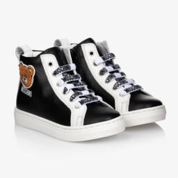 White leather sneakers by luxury Italian brand, Moschino Kid-Teen. Designed for both boys and girls, these low-rise lace-up trainers have a Teddy Bear logo appliqué at the sides. The contrast black heels are padded for comfort and they are fully lined in leather, with a non-slip rubber outer sole.