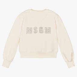 Stylish and eye-catching, a purple cotton sweatshirt for girls by MSGM, with a sparkling silver diamanté and beaded logo on the front. Made in comfortable jersey with a cosy, fleecy inside and a relaxed fit, it has a ribbed V-neckline and full sleeves with ribbed cuffs for extra cosiness.