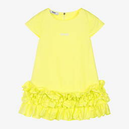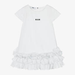 White cotton poplin dress for girls by MSGM, made from lightweight fabric and lined for added comfort. This dress features a round neckline, capped short sleeves, and a delicate A-line shape with charming ruffles at the hem. It fastens with a concealed zip at the back and is adorned with a subtle black micro logo on the front. Last chance to buy this elegant piece, available in limited quantities.