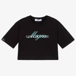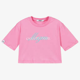 Girls pink cotton T-shirt by MSGM, with a boxy cropped fit. It has the words 'GIOIA DI VIVERE' printed in white on the front, meaning 'joy of living', with a raised blue logo lettering over the top. There is a white cloth logo tab on one sleeve.