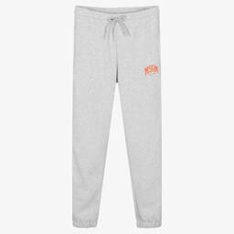 Black joggers for teen boys by MSGM, with a bold orange logo print on one leg. Made in soft, mid-weight cotton jersey, they are fleecy on the inside for extra warmth. They have concealed side seam pockets and a back patch pocket. There is a useful drawstring waist for a comfortable fit and a colourful logo patch on the back for a bright designer finish.