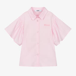 From Italian brand MSGM, pink blouse for teen girls with a floral print incorporating the brand name subtly throughout. This pretty cropped blouse has ties on the front which bow for a retro-finish, and the back of the hem is elasticated for added comfort. Soft and lightweight, it fastens with branded buttons on the front and has seamless turn-up sleeves.