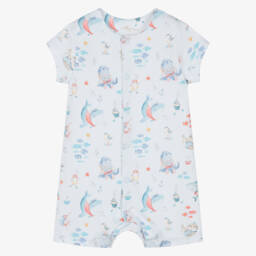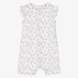 Girls pink Supima cotton shortie by My Little Pie is made from soft organic Supima cotton. Beautifully soft and comfortable, it features a lovely magnolia print in shades of pink and ivory. The shortie has popper fastenings down the front and between the legs for quick and easy dressing. Limited quantities available, so don't miss your last chance to buy this exquisite piece.