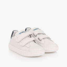 White leather trainers for boys by Naturino, with easy to fasten double velcro straps. Lined in soft leather with light padding for added comfort, these casual trainers have a contrasting black panel on the heel with a subtle embossed N branding. The outer soles have a distressed worn look for vintage style appeal and are made from non-slip rubber for improved grip.