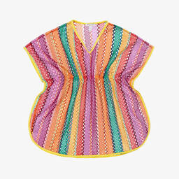 Girls blue and multicolour stripe beach kaftan by Nessi Byrd is exclusive to Childrensalon. Crafted from a light and airy crochet knit, the kaftan features a delightful array of pastel stripes in pink, blue, yellow, and green, accented with a sunny yellow trim. The gently elasticated waist offers a comfortable fit, making it an ideal coverup for beach outings or poolside lounging. Limited quantities available, ensuring a unique addition to any wardrobe.