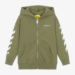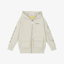 Boys blue cotton zip-up hoodie by Off-White, crafted from soft mid-weight cotton jersey. The cool painted style features white diagonals down each arm, a signature arrow motif on the back, and a Bookish logo on the chest. Ideal for casual wear, this long-sleeved top includes practical front pockets. Limited quantities available, last chance to buy.